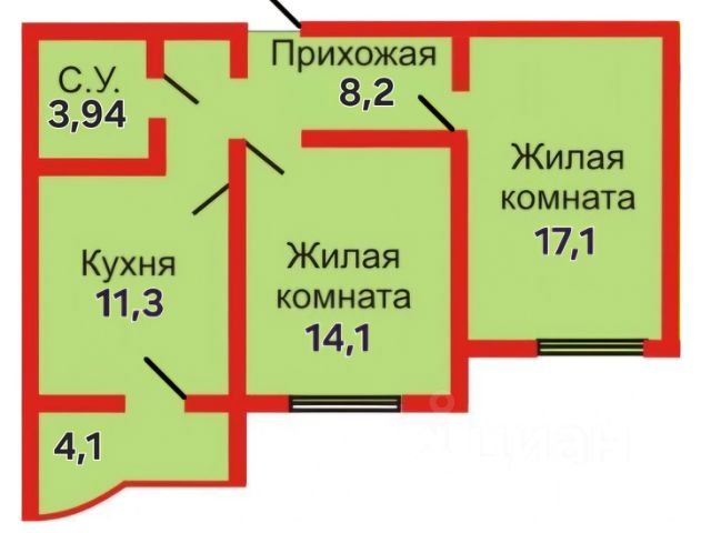 > Общая площадь: 56,2 м2. Кухня 16,6 м2, Зал - 14,4 м2, Спальня - 12,0 м2, С/У - 5,0 м2, Прихожая 8,2 м2, + Лоджия - 4,22 м2 (не входит в общую площадь).