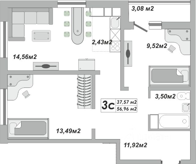 Классическая планировка трёхкомнатной квартиры, отлично подходящая для семьи с детьми.