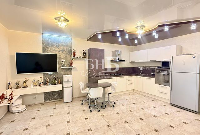 Высокие потолки 2,8 м, установлен теневой потолок, световые лини, смонтированы скрытые гардины и скрытые вытяжки.