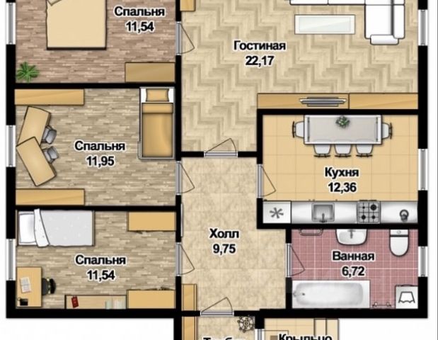 На первом этаже просторная кухня гостиная 28,3 кв.м. с панорамным окном и выходом на террасу, гостевой санузел, кладовая и гараж. На втором этаже мастер-спальня 18 кв.м с гардеробной и душевой-прачечной, просторная ванная с санузлом и две детские спальни.