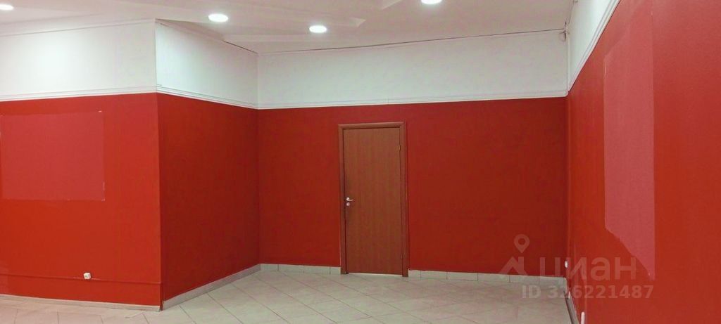Большой зал на 56 м.кв. можно зонировать или использовать целиком под цели бизнеса. В помещении уложена напольная плитка. Станы выровнены, оштукатурены и окрашены в цвета бывшего арендатора. На потолке дизайнерская композиция из гипсокартона со встроенными светильниками.