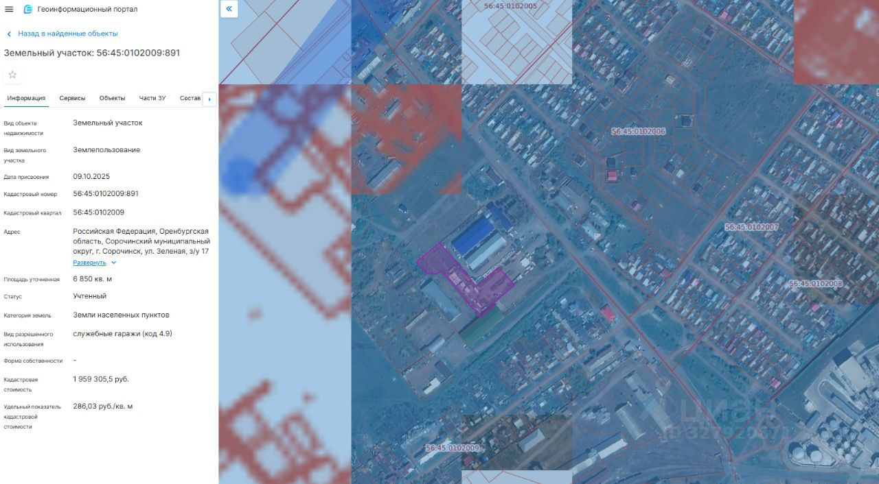 земельный участок с кадастровым номером 56:45:0102009:891, площадью 6850 кв.м., категория земель: земли населенных пунктов, виды разрешенного использования: служебные гаражи (код 4.9). Адрес: Российская Федерация, Оренбургская область, Сорочинский муниципальный округ, г. Сорочинск, ул.Зеленая, з/у 17 Г