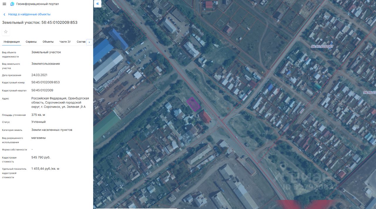 земельный участок с кадастровым номером 56:45:0102009:853, площадью 375 кв.м., категория земель: Земли населенных пунктов, Виды разрешенного использования: магазины. Адрес: Российская Федерация, Оренбургская область, Сорочинский городской округ, г. Сорочинск, ул. Зеленая ,9 А