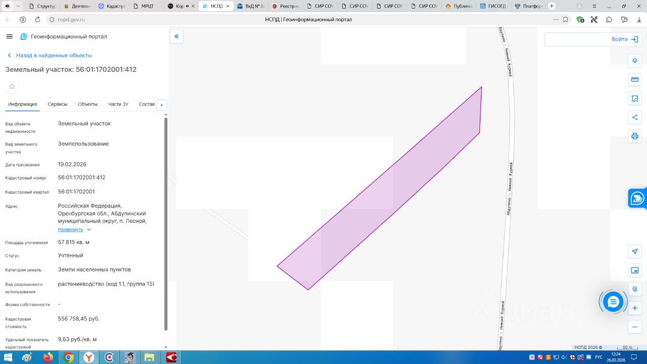 Земельный участок с кадастровым номером 56:01:1702001:412 площадь 57815 по адресу Российская Федерация, Оренбургская обл., Абдулинский муниципальный округ, п. Лесной, северо-восточная часть кадастрового квартала 56:01:1702001