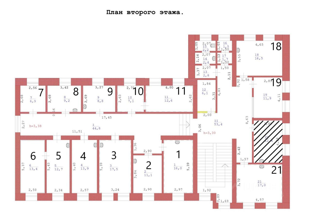 Сдаётся в аренду помещение свободного назначения (торговля, офис, банк, салон красоты) расположенное на 2-м этаже в отдельно стоящем кирпичном здании по адресу ул. Лабужского 8. 2- этаж можно арендовать полностью либо по кабинетно. Не сдаётся только помещение которое на плане заштриховано, оно выделено для пожарной безопасности.