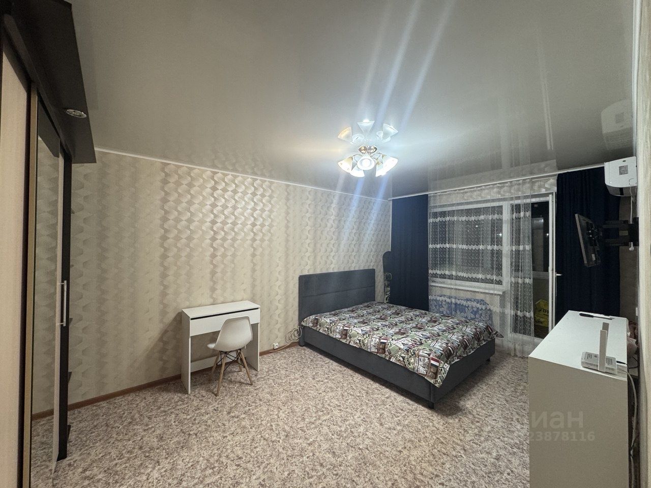 мебель: кухонный гарнитур, стол и 4 стула, большая двуспальная кровать, шкаф-купе, туалетный столик, стеллаж, шторы black out на балконе — дополнительный шкаф.