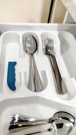 Двуспальная кровать, раскладывающийся диван, стулья барные, кухонные и на колесах. Стол засервирован, наборы посуды и кухонных принадлежностей размещены в кухонных шкафах. Постель застелена. Комплекты полотенец, наборы зубных щеток, шампунь, кондиционер, фен в ванной комнате.