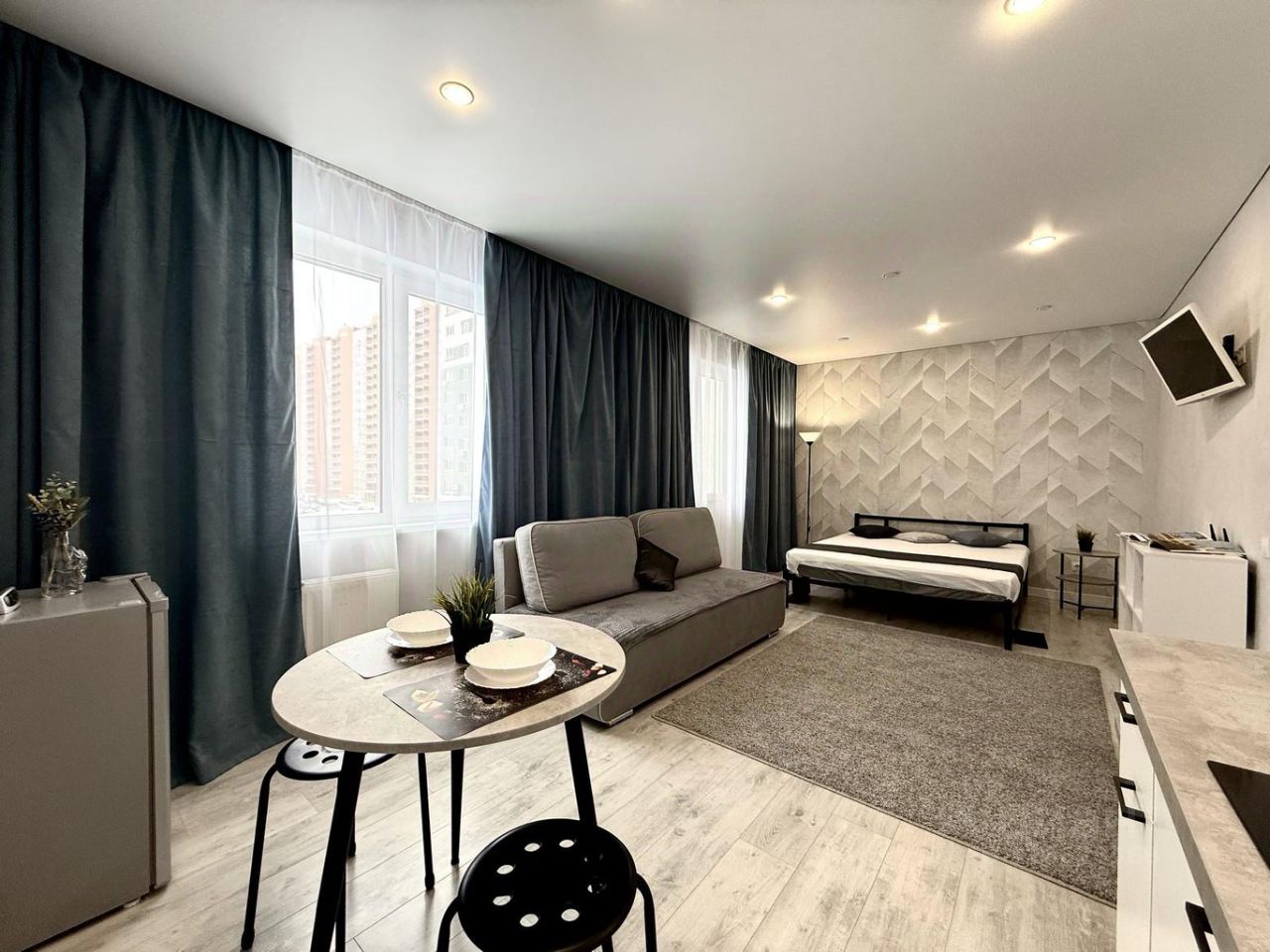 Комплект хлопкового постельного белья и полотенца. Базовый комплект постельных принадлежностей предоставляется бесплатно (в 1-комнатной квартире — на одну двуспальную кровать). Если вам понадобятся дополнительные комплекты, сообщите заранее, пожалуйста (1 комплект — 300 ₽).;