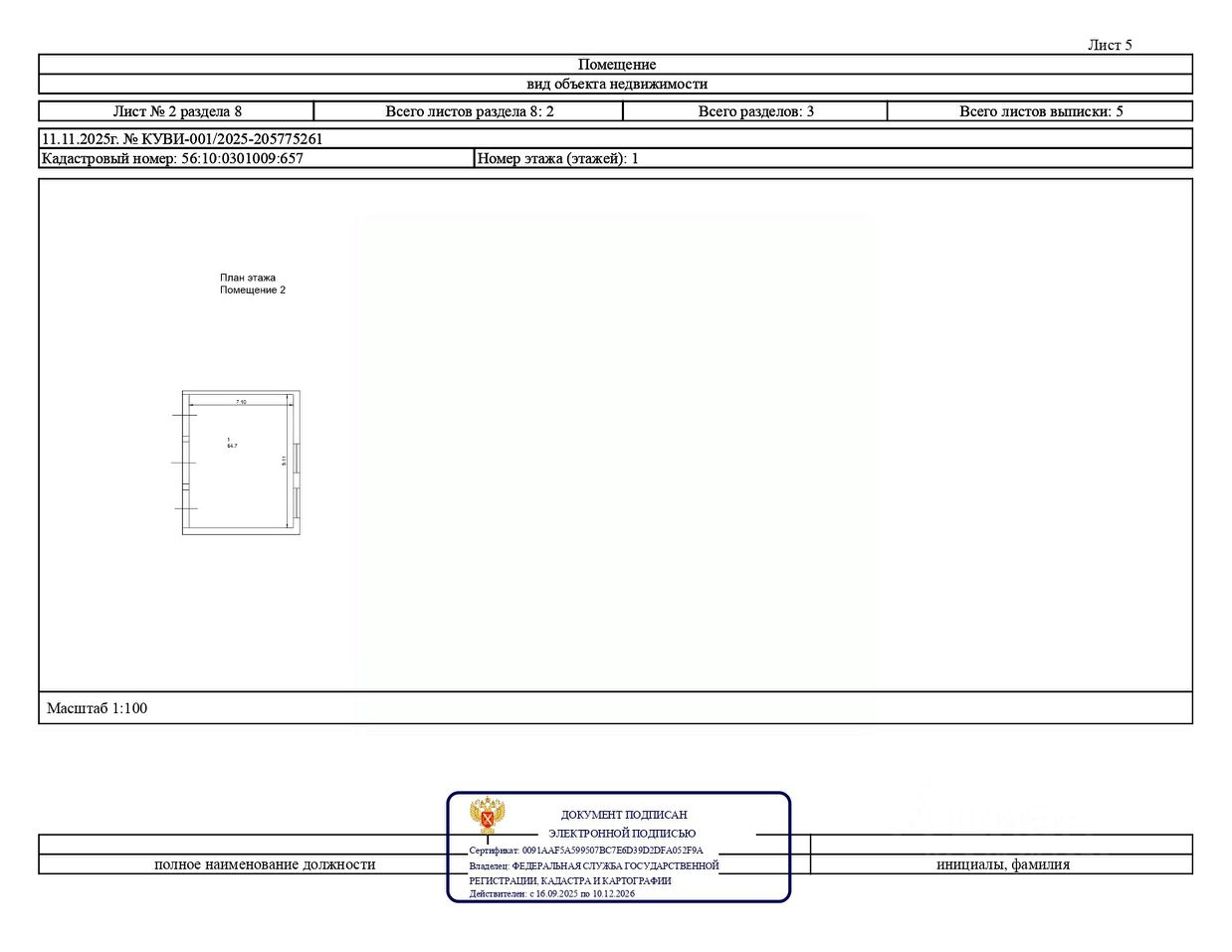 Помещение 2, расположенное с. Грачевка, ул. Чапаева, д. 15 с кадастровым номером 56:10:0301009:657, площадью 64,7