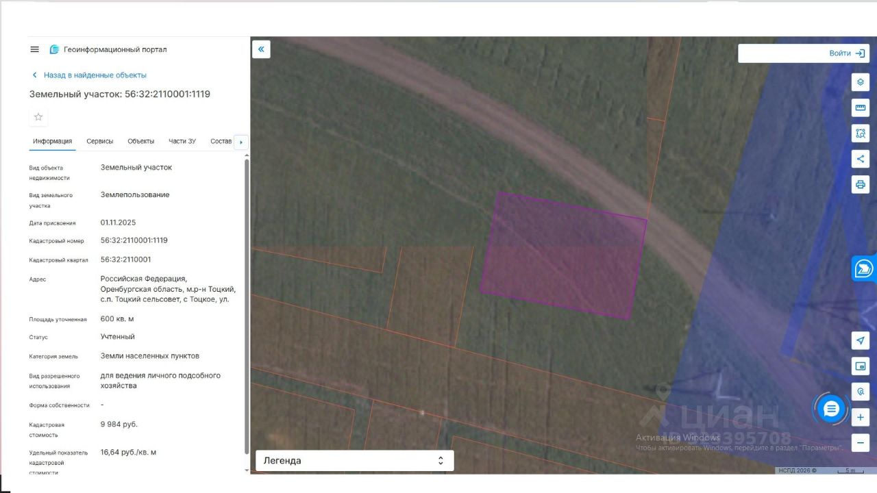 Земельный участок с кадастровым номером 56:32:2110001:1119 площадь 600 кв.м.