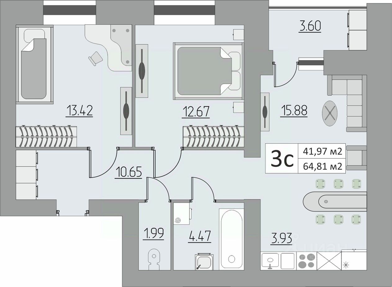 3-комн. квартира, 64,81 м²