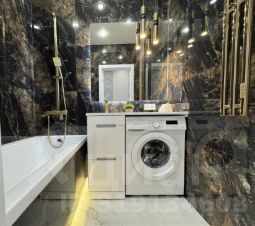 Ванна с нишей, подсветкой и тропическим душем , электрический полотенцесушитель , установлена стиральная машина и пенал