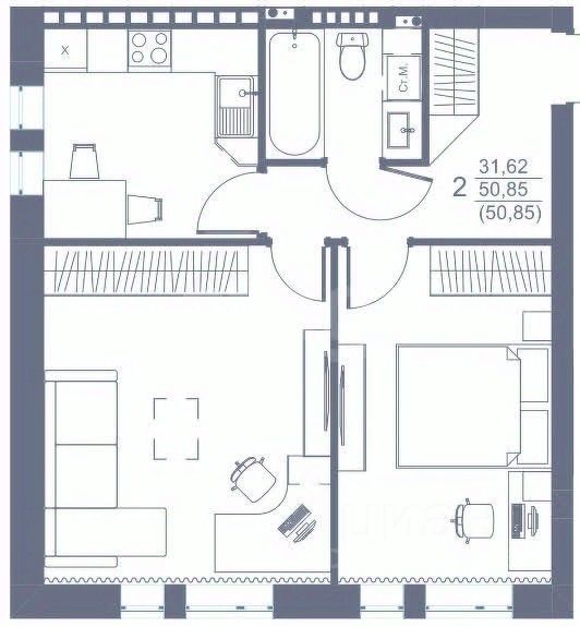 Двухкомнатная квартира площадью 50,85 кв.м., кухня 9 кв.м.