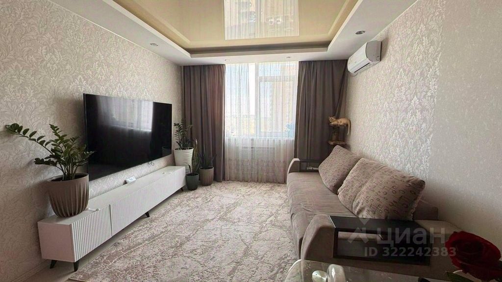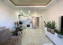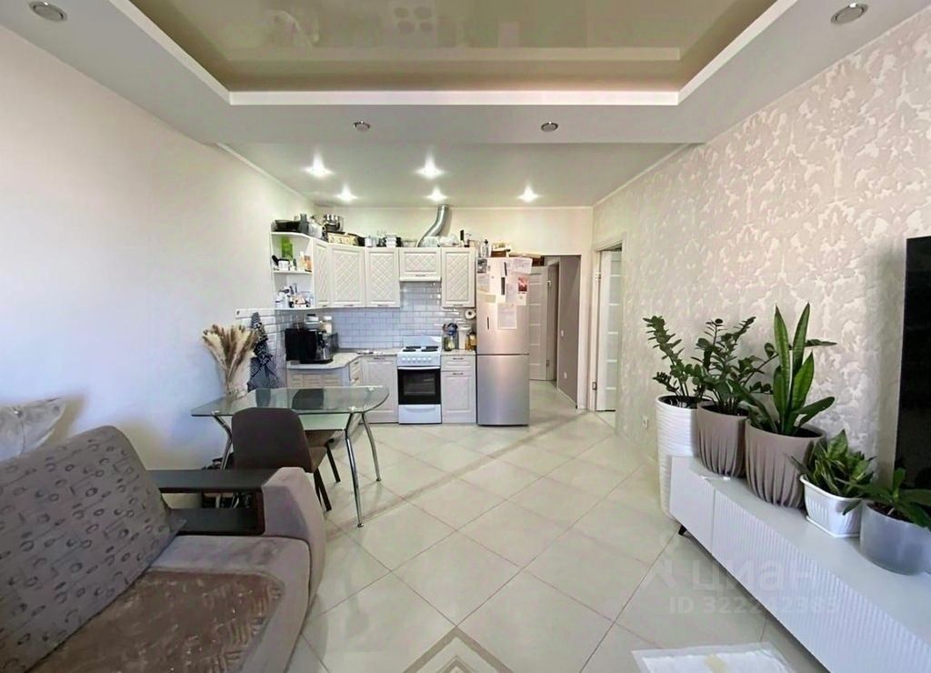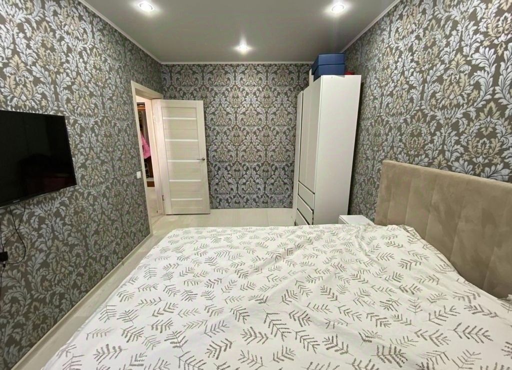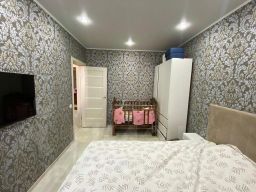 Стены и полы выровнены. Во всей квартире натяжной потолок . Точечным освещением в ванной.
