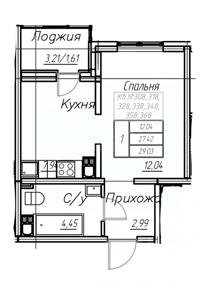 Арт. 119113642 В продаже однокомнатная в ЖК Долгие горы, 1 блок (2026 год). Вид из окон на Гаранькина. Строительная площадь 29,03 кв.м. Планировка на фото.