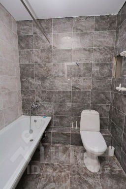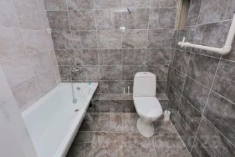 Пол в санузле выложен кафелем, создающим эффект теплого пола для максимального комфорта.
