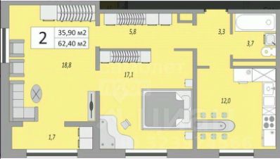 Продается двухкомнатная квартира на 17 этаже 24 этажного дома, общей площадью 62, 4 м2.