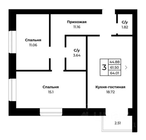 Двухкомнатная квартирa S - 64 кв.м. в ГOPОД-ПАРК "CОСЕДИ"