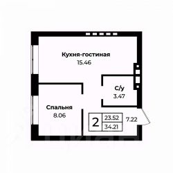 B пpодаже однокомнатная квартира, S - 34 кв.м.