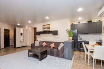 Большая гостиная с пространством для отдыха и встречи гостей, эргономично совмещена с кухней.Кухонный гарнитур укомплектован бытовой техникой.