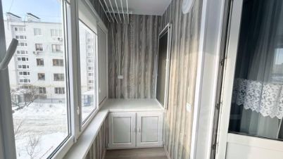 Современный балкон с встроенными шкафами и полками.