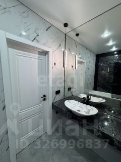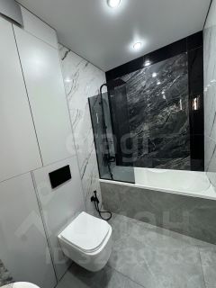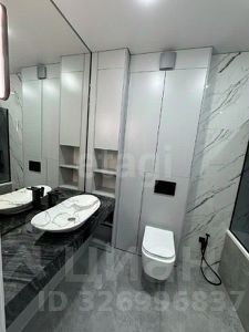 Большой санузел оборудован системой хранения и тропическим душем. Данное решение идеально подходит для молодой семьи или пары, ценящей современное качественное жилье, где продумано личное пространство для каждого, сочетающее возможности для работы, отдыха и уединения.