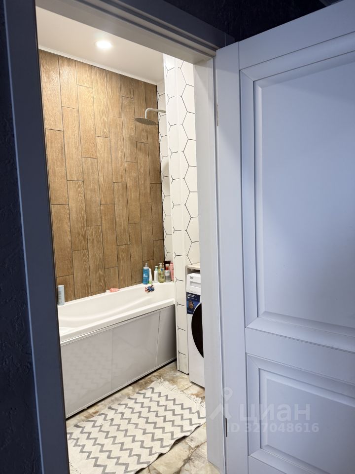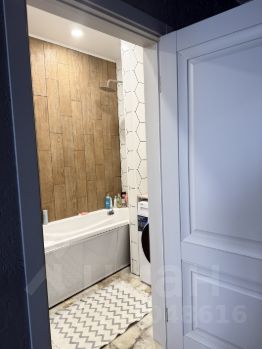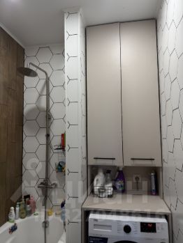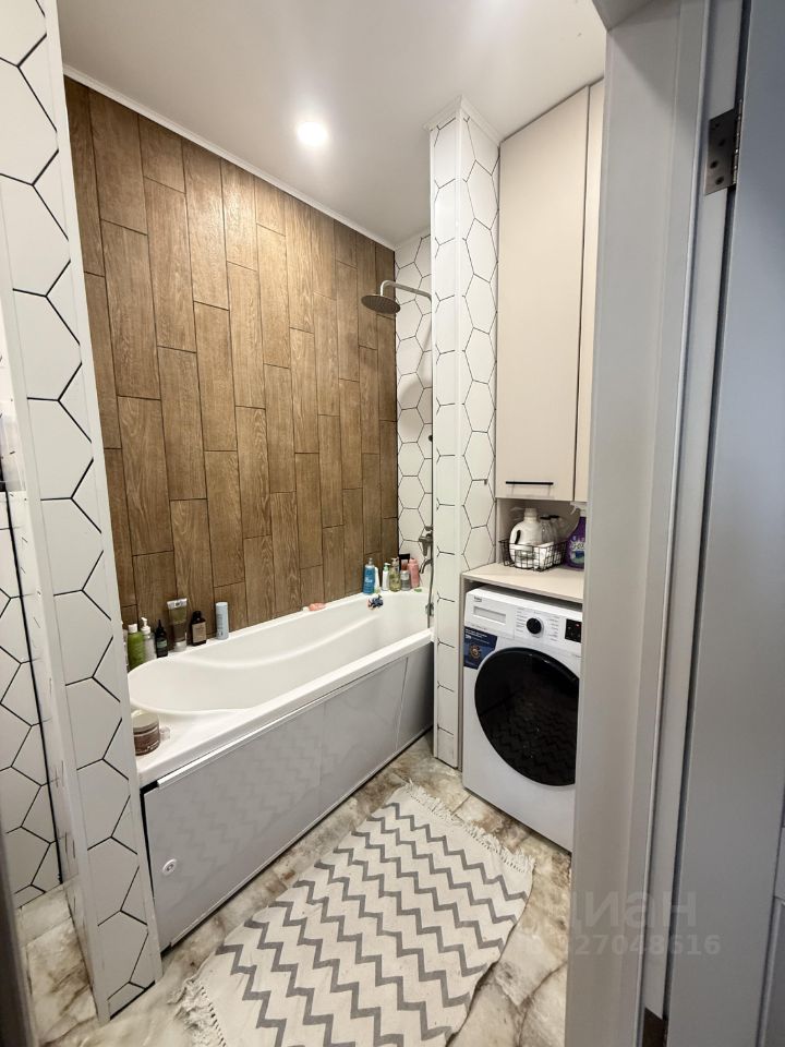 В ванной комнате выполнен подвесной туалет , ванна отделена с двух сторон небольшими стенами , тумба с раковиной идеально встроена в нишу , а так же в нишу установлен шкаф с для полотенец и вещей , испанская плитка на полу и шестиугольная плитка на стенах не оставит вас равнодушными .
