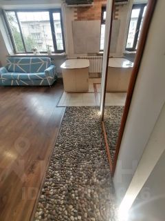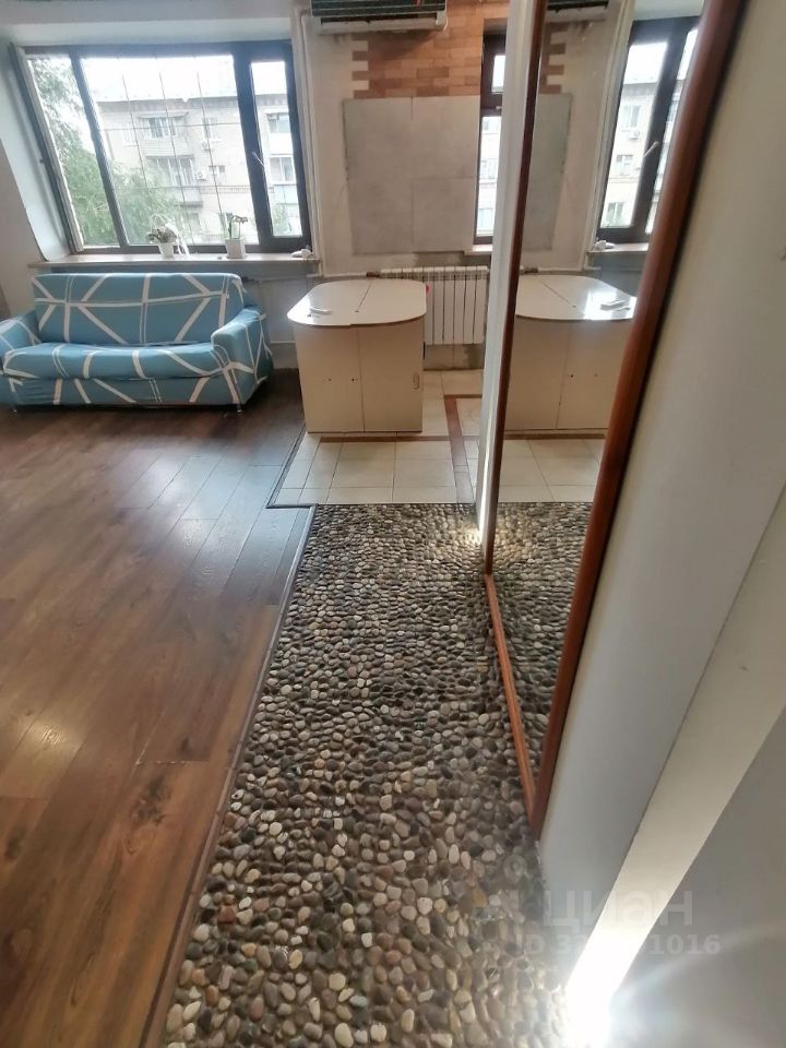 Дизайнерский ремонт студии с полностью выровненными стенами и встроенными тёплыми полами (счищали до арматуры и заливали новые). Возле зеркала в полный рост на полу выложены натуральные камушки, по которым Вы можете ходить босиком, сливаясь с природой в зимнее время года (они тоже с подогревом).