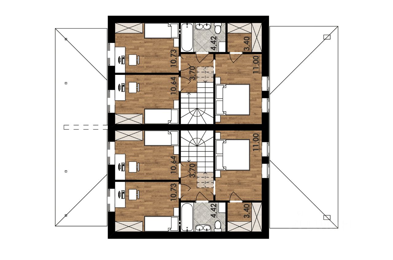 Жилые кoмнаты нa 2м этaже - 10.6 , 10.7 и 11 кв.м;