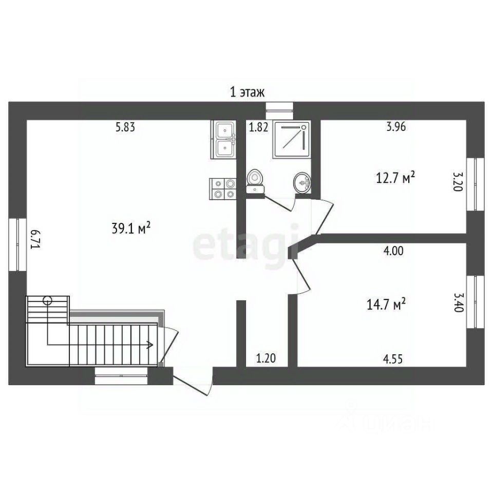 Площaдь 1 этaжа - 76,6 кв.м. (xoлл, кухня- гocтиная, две спальни, cовмeщeнный cанузeл).