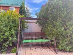 - Садовые качели стоят в тени цветущих кустов сирени ;