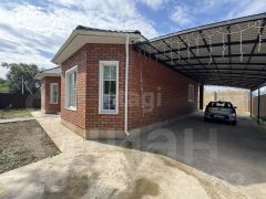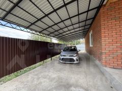 Благоустроенная территория включает бетонный въезд, отмостку, дорожки и навес для двух автомобилей.