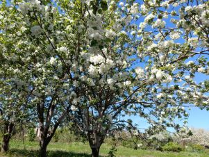 2 вида винограда - белый и черный, смородина красная, черная, белая, 2 куста крыжовника разных сортов, малина, черевишня, облепиха, 6 сортов яблонь, вишня деревковая, клубника 2х сортов - ранняя и поздняя, цветы