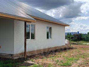 Крыша покрыта металопрофилем, гидро-пароизоляция, утеплитель в три слоя, перекрытия деревянные. Фронты зашиты маталопрофилем. Вокруг дома по периметру отмостка. По переднему плану устанавливаем забор с калиткой и воротами.