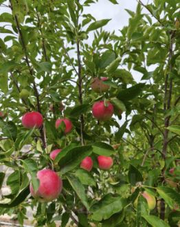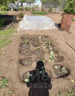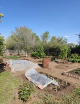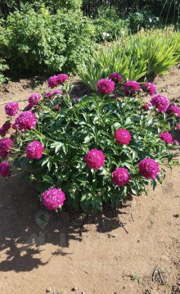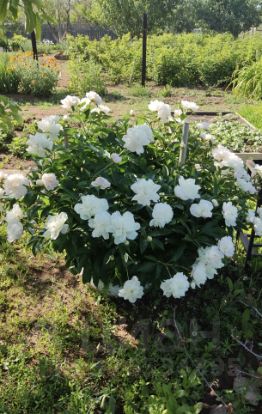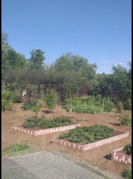 Посажены различные фрукты и овощи. Вишня очень крупная, разные сортовые яблони, боярышник, абрикос, черешня, груша, жимолость, малина трех сортов, красная и черная смородина, черемуха,клубника, много пионов.