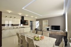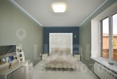 На первом этаже кухня-столовая, спальня, санузел, гардеробная.