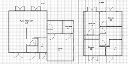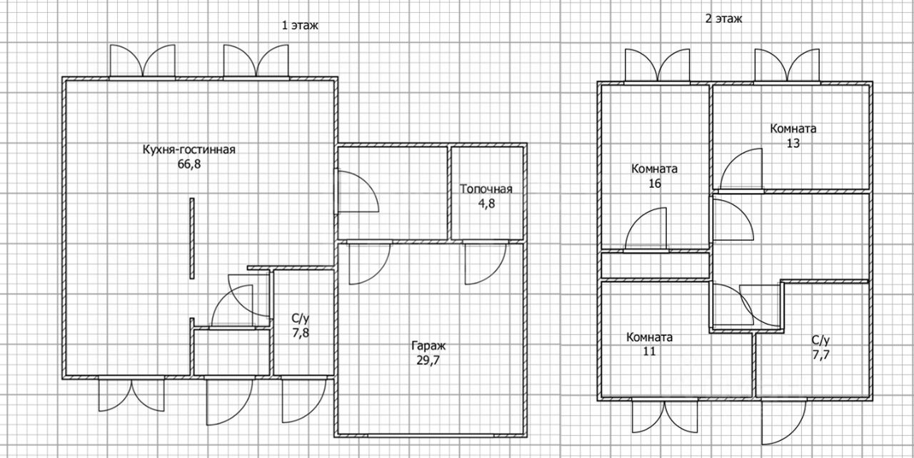 Планировка: 1 этаж - кухня-гостинная 66,3 кв.м., просторный коридор, санузел, бойлерная.