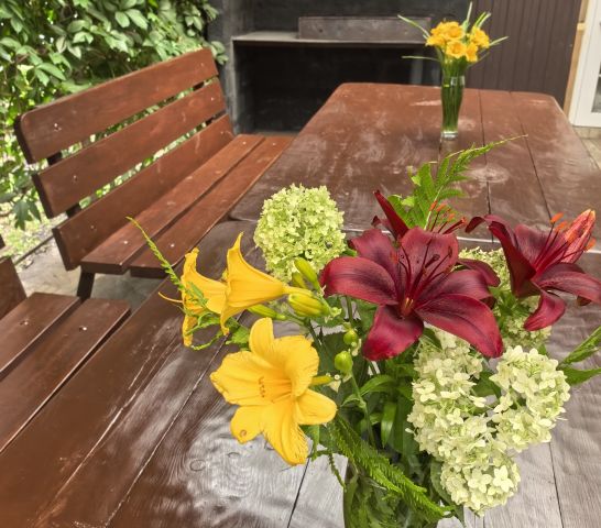 Большая беседка 3х5 м — настоящая гордость! Внутри: топчан, большой обеденный стол, лавки и стулья, шкаф для посуды.