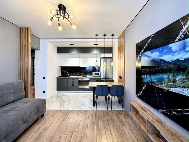 Удобную укомплектованную кухню с обеденной зоной, посудой для приготовления и приёма пищи.